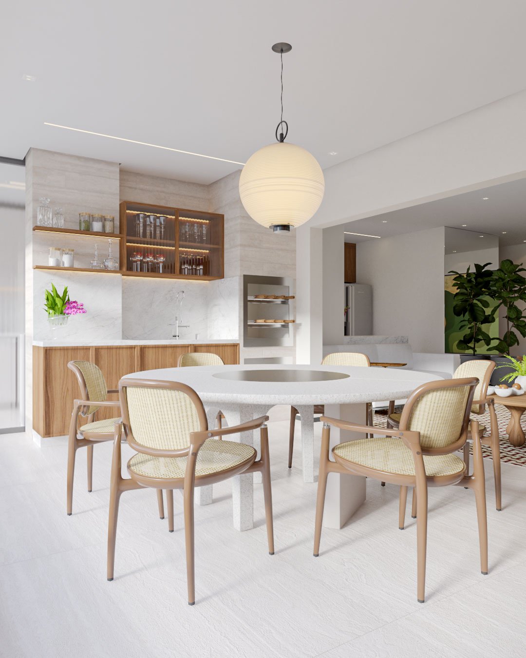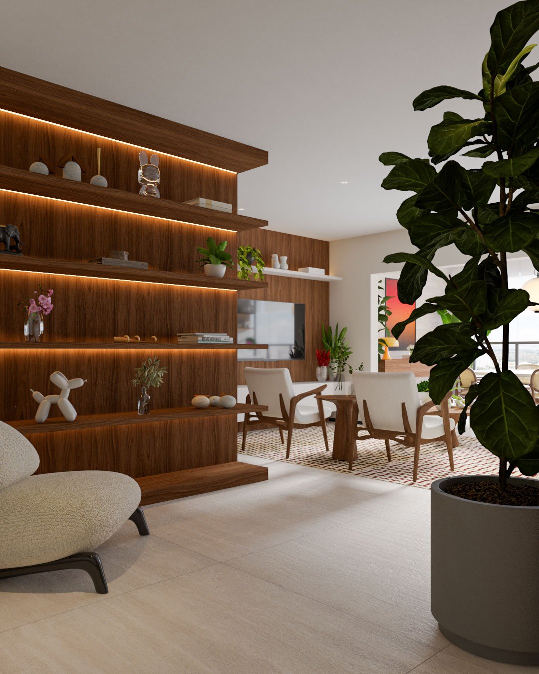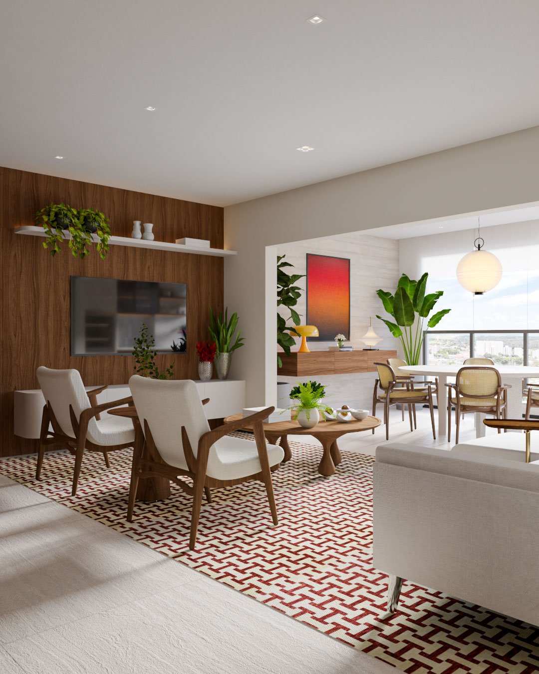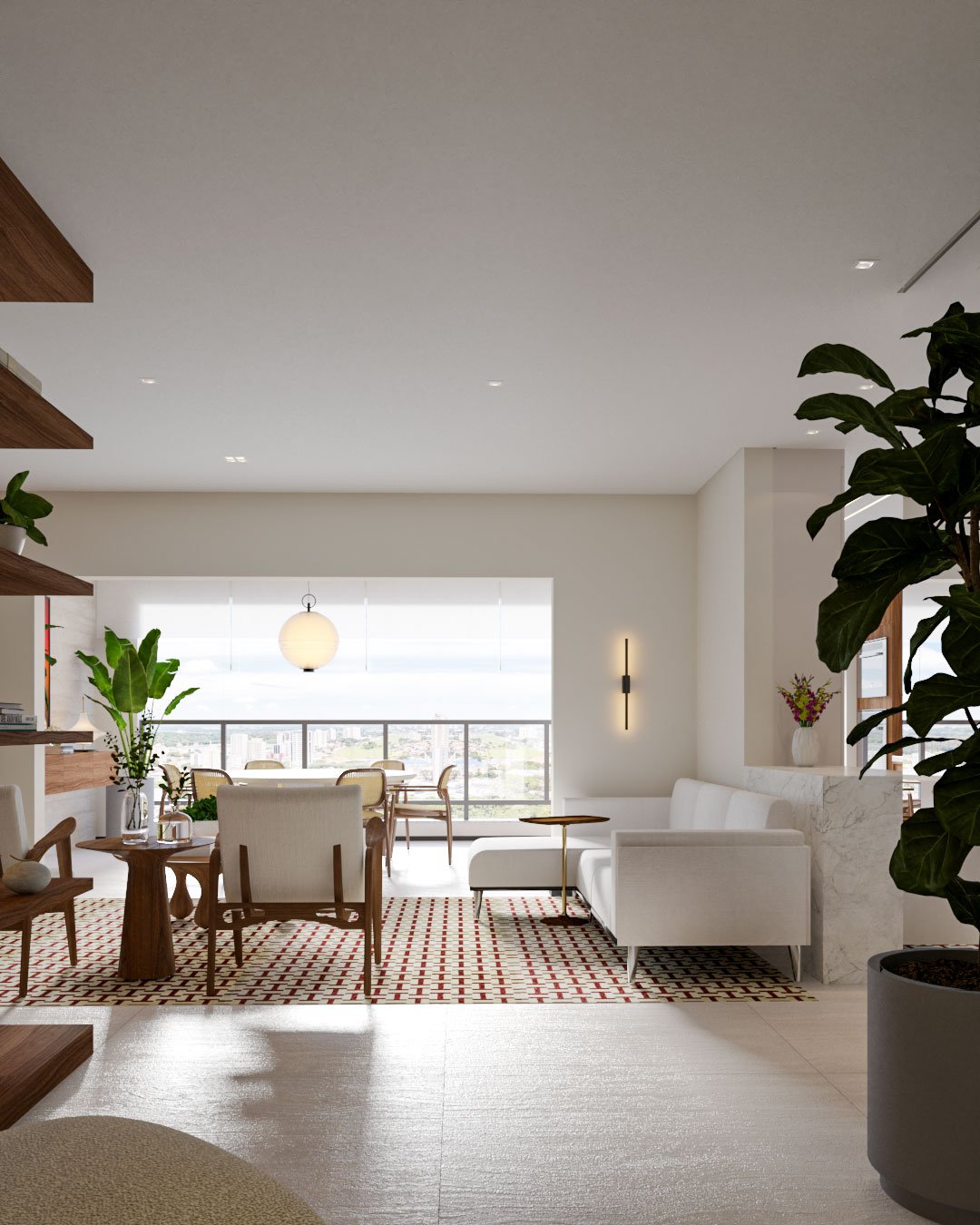 Projeto inspirado no modernismo brasileiro com toques contemporâneos, que valoriza materiais naturais, linhas limpas e uma paleta atemporal. Os ambientes unem elegância e funcionalidade: living com peças de design e personalidade, varanda gourmet intimista, cozinha em mármore e madeira, lavanderia integrada, lavabo em quartzito, quartos infantis temáticos e uma suíte master sofisticada com detalhes em pedra e iluminação aconchegante.