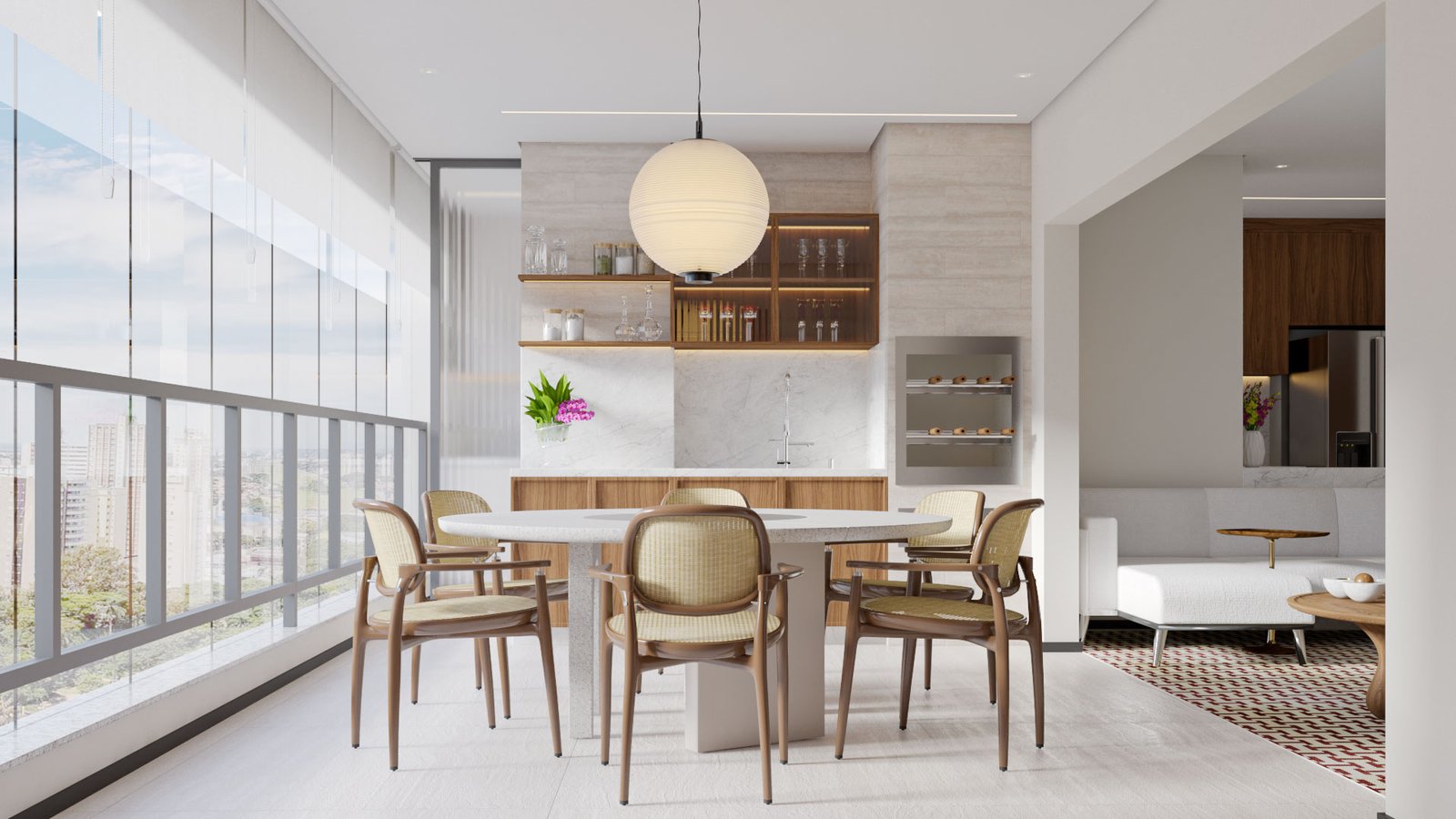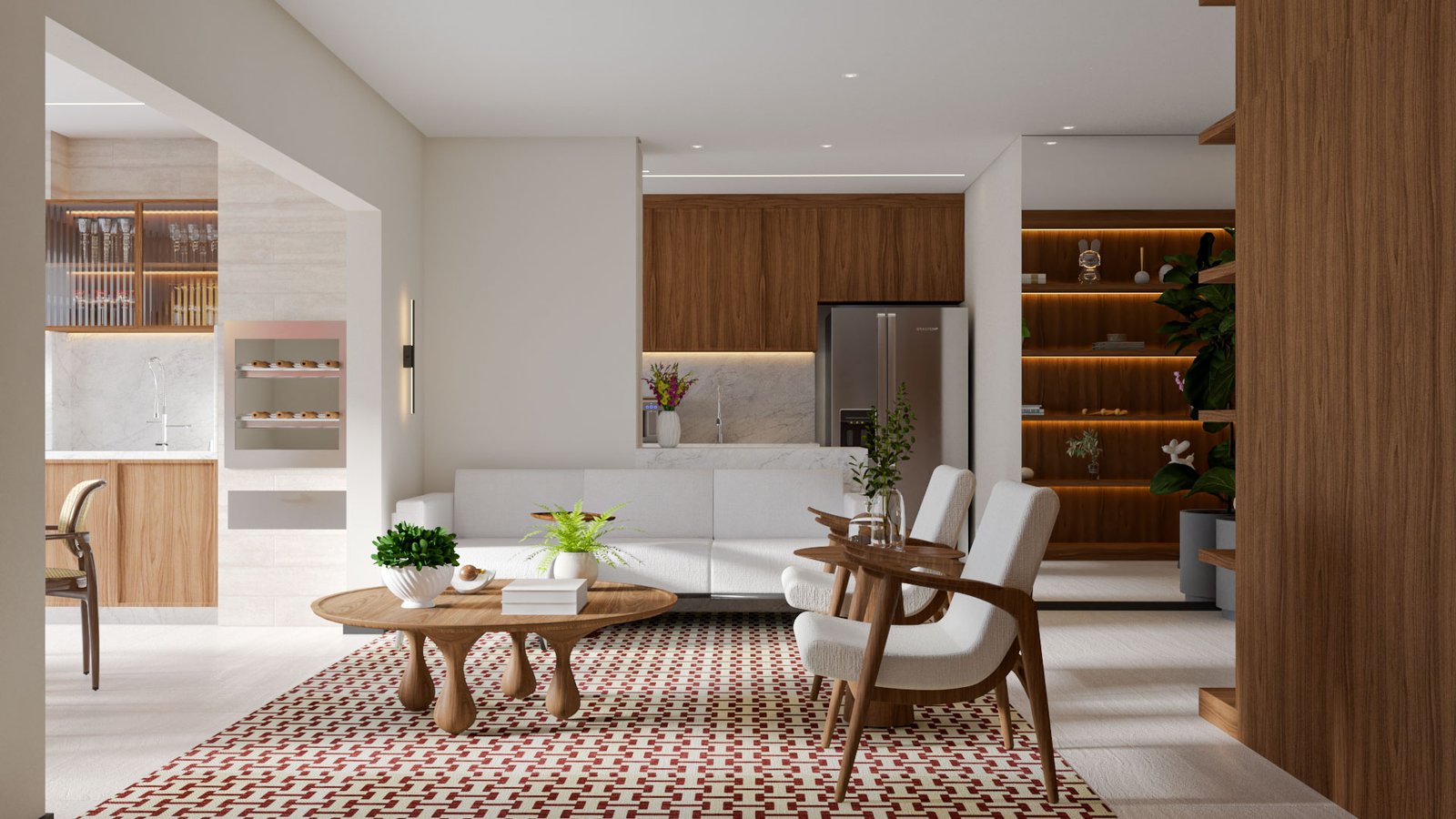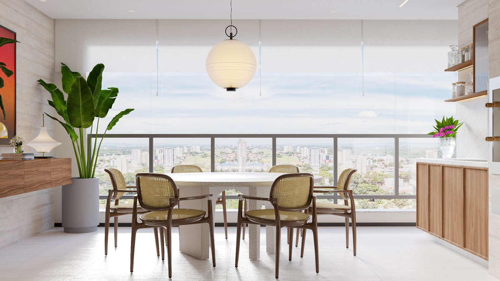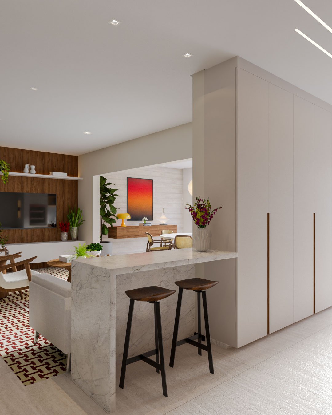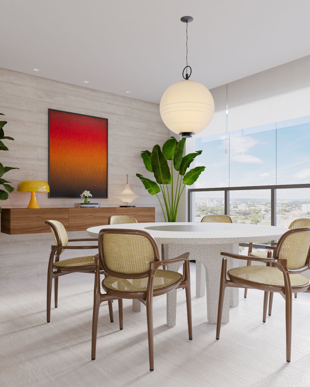 Projeto inspirado no modernismo brasileiro com toques contemporâneos, que valoriza materiais naturais, linhas limpas e uma paleta atemporal. Os ambientes unem elegância e funcionalidade: living com peças de design e personalidade, varanda gourmet intimista, cozinha em mármore e madeira, lavanderia integrada, lavabo em quartzito, quartos infantis temáticos e uma suíte master sofisticada com detalhes em pedra e iluminação aconchegante.