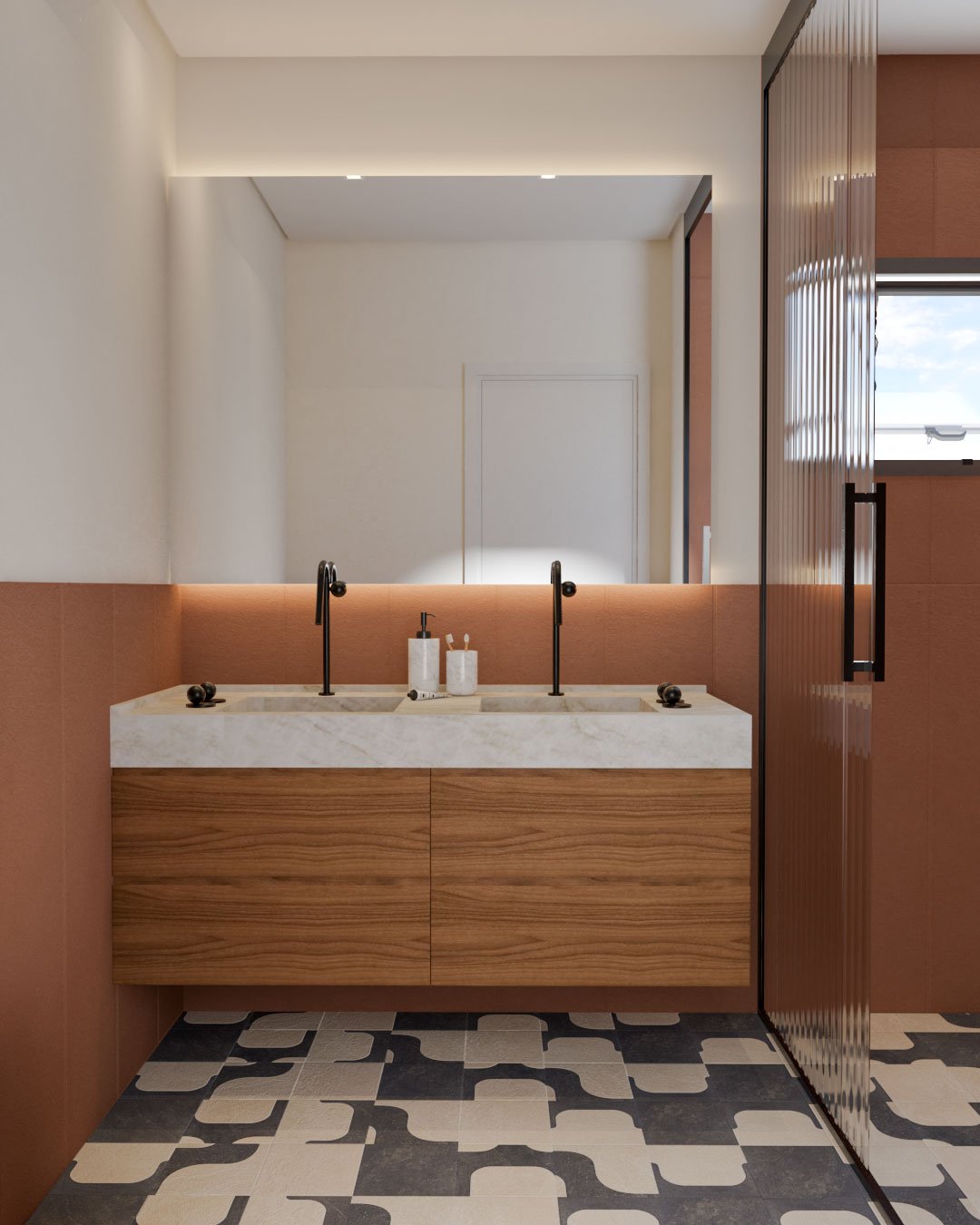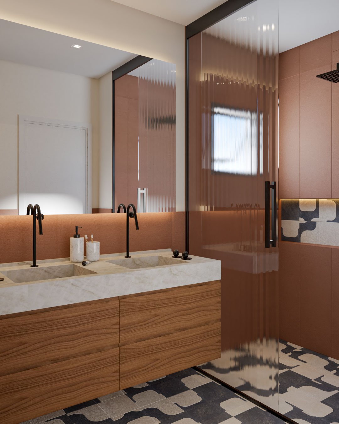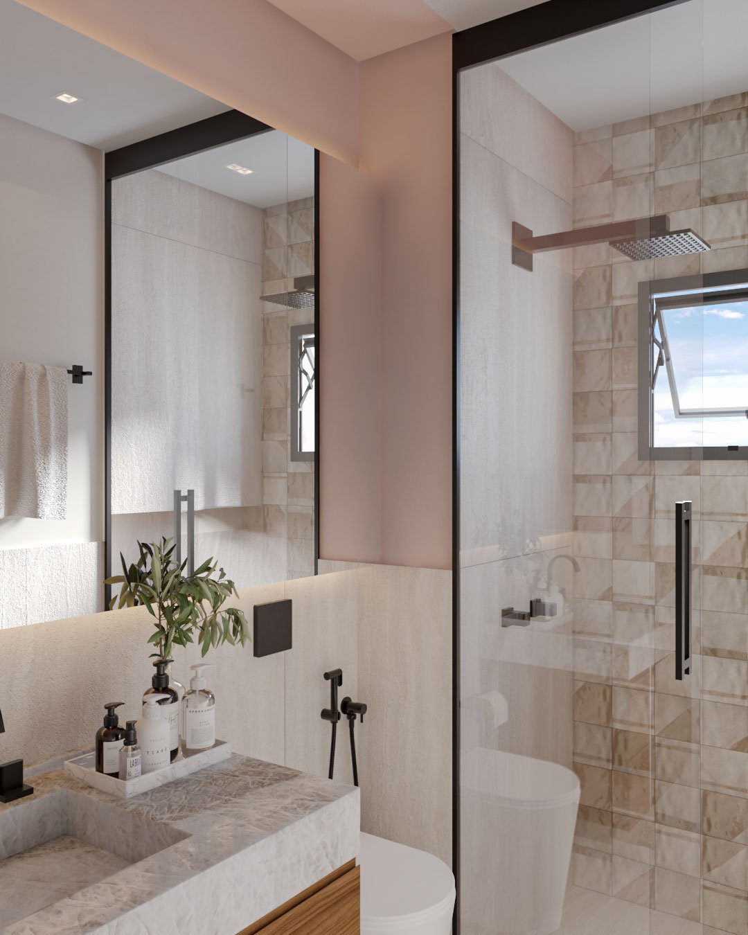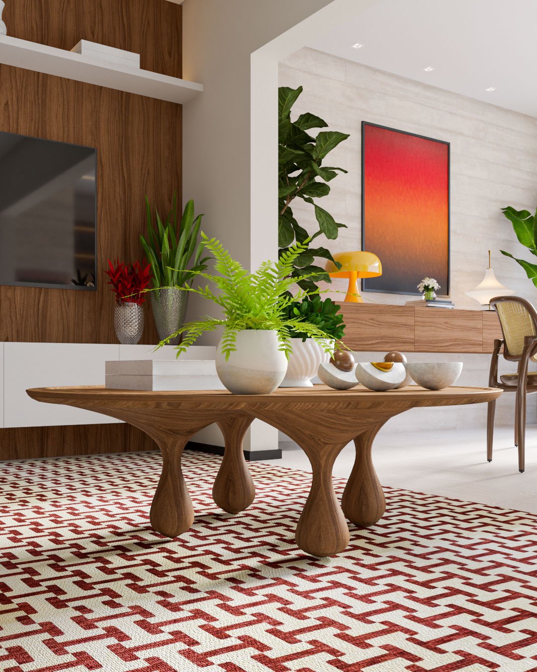 Projeto inspirado no modernismo brasileiro com toques contemporâneos, que valoriza materiais naturais, linhas limpas e uma paleta atemporal. Os ambientes unem elegância e funcionalidade: living com peças de design e personalidade, varanda gourmet intimista, cozinha em mármore e madeira, lavanderia integrada, lavabo em quartzito, quartos infantis temáticos e uma suíte master sofisticada com detalhes em pedra e iluminação aconchegante.