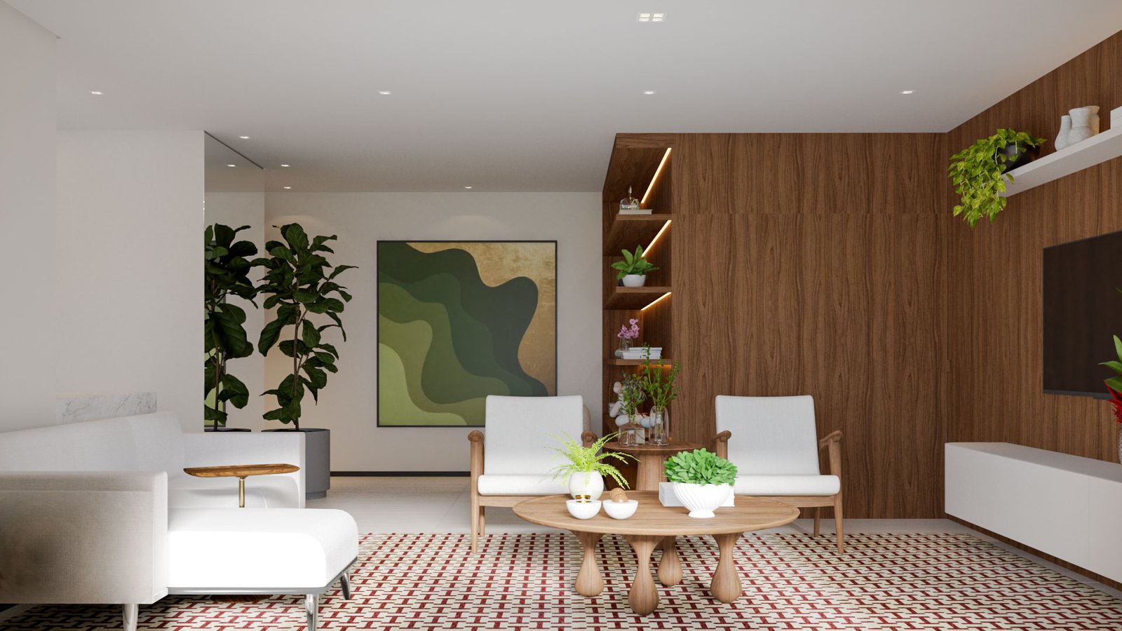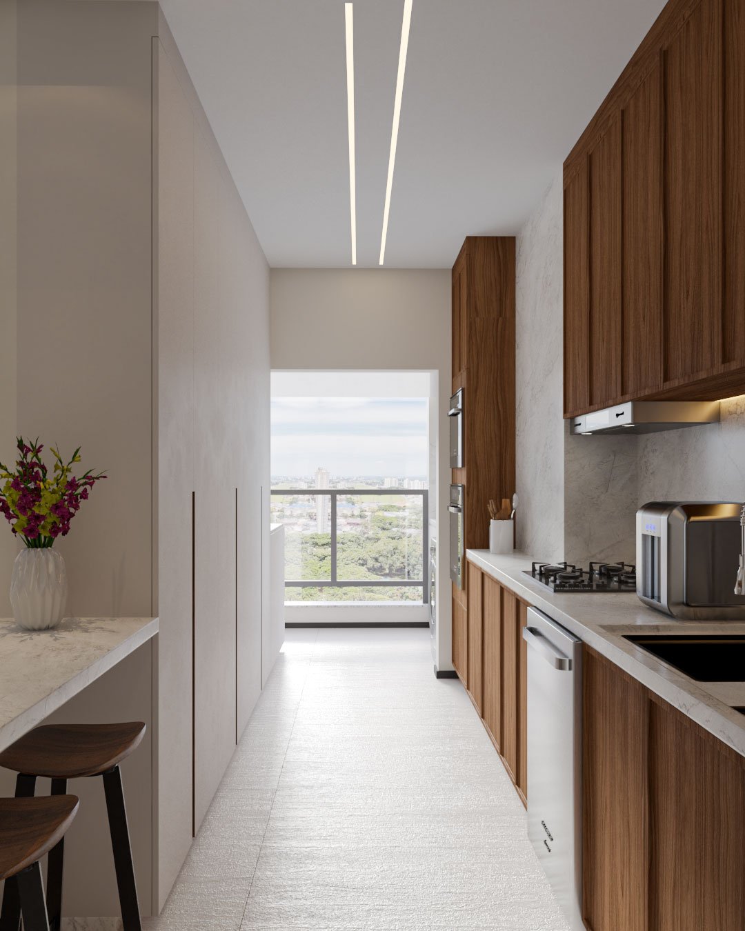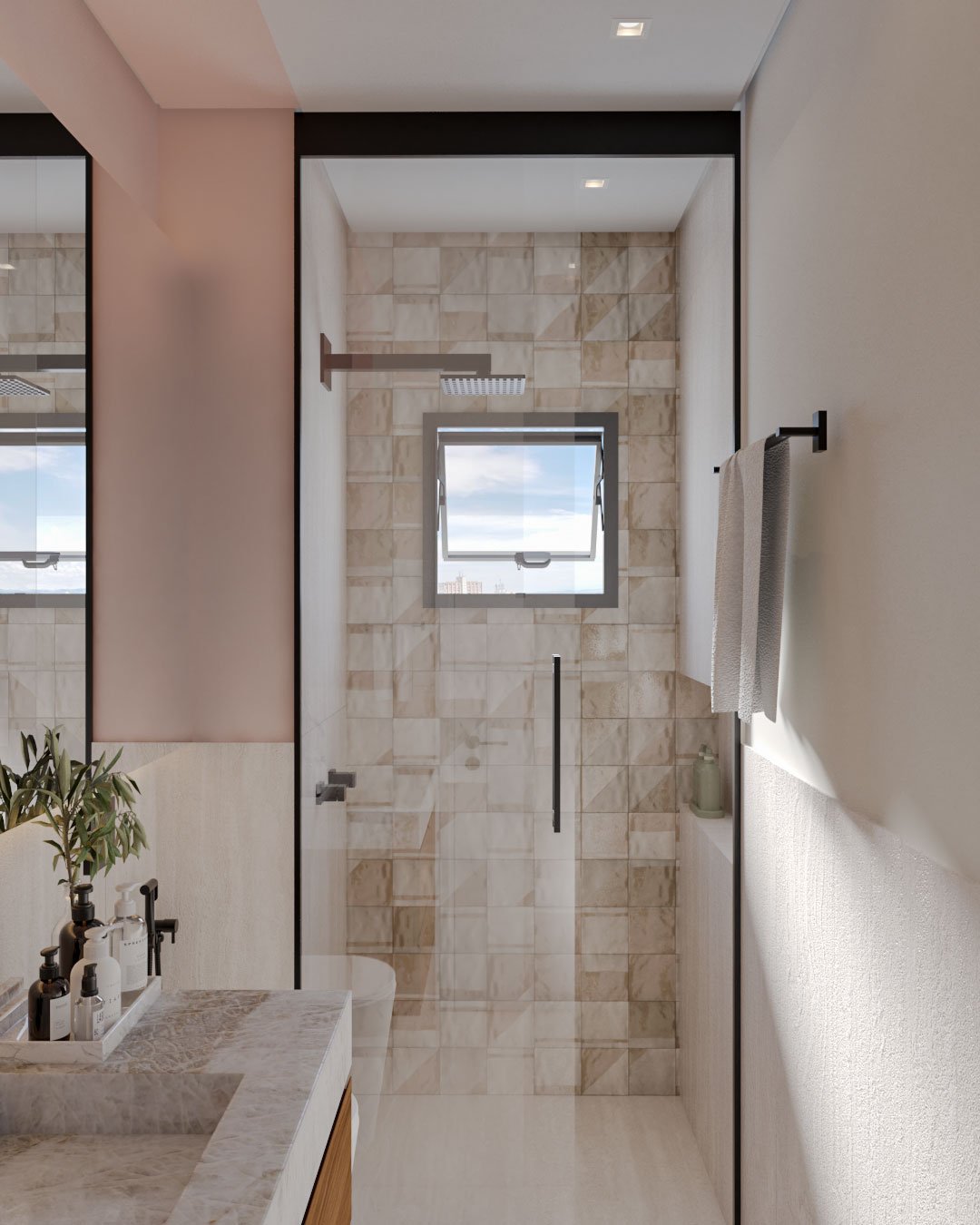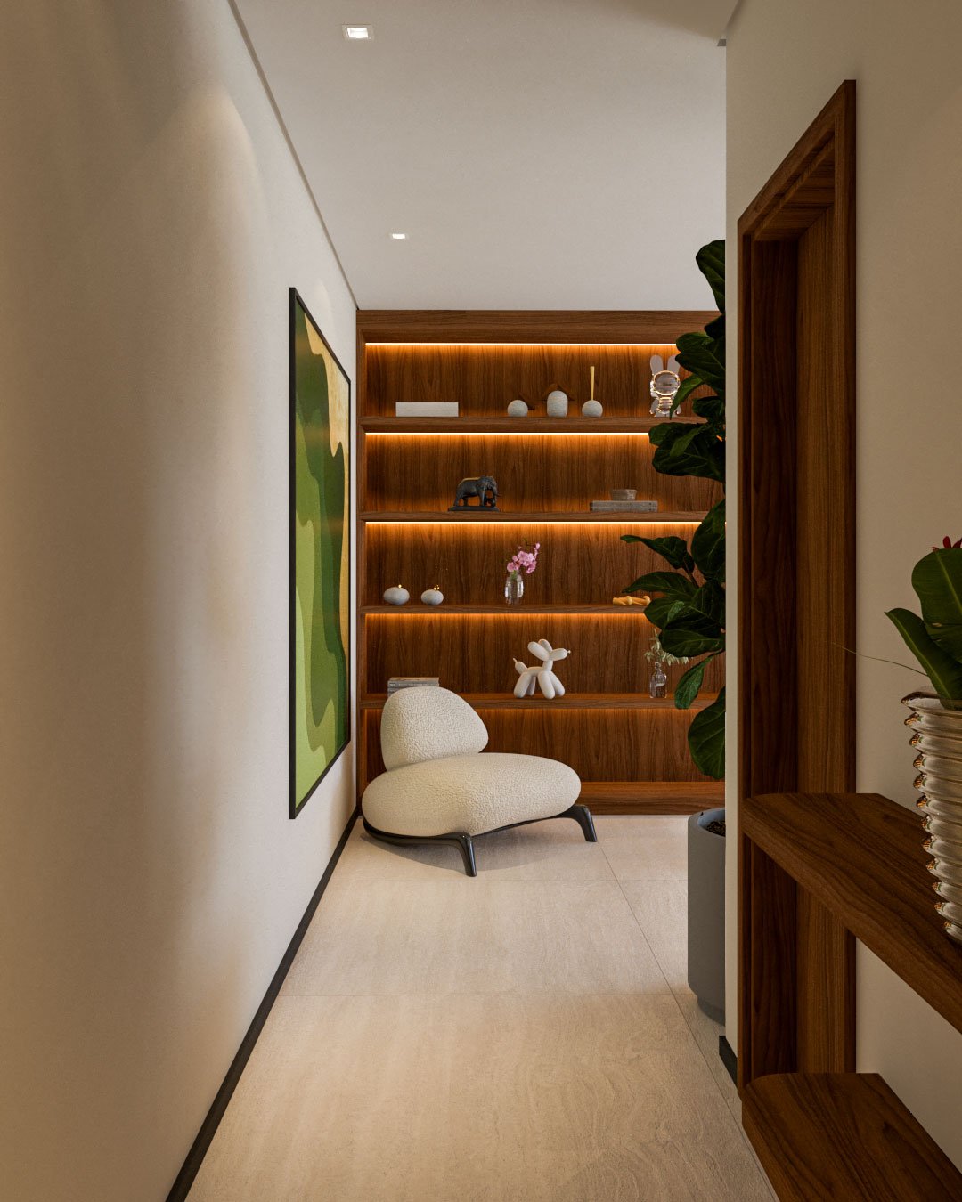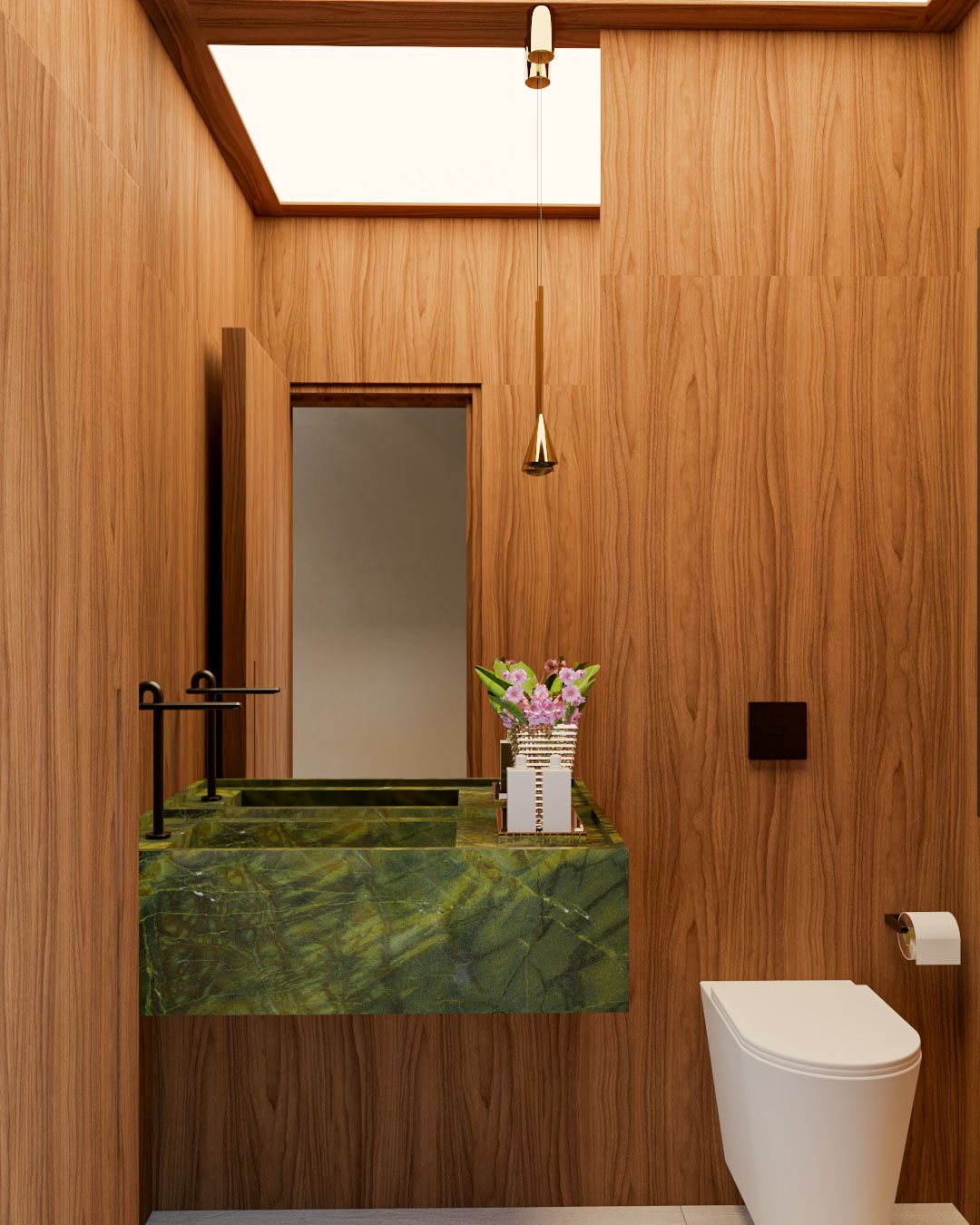 Projeto inspirado no modernismo brasileiro com toques contemporâneos, que valoriza materiais naturais, linhas limpas e uma paleta atemporal. Os ambientes unem elegância e funcionalidade: living com peças de design e personalidade, varanda gourmet intimista, cozinha em mármore e madeira, lavanderia integrada, lavabo em quartzito, quartos infantis temáticos e uma suíte master sofisticada com detalhes em pedra e iluminação aconchegante.