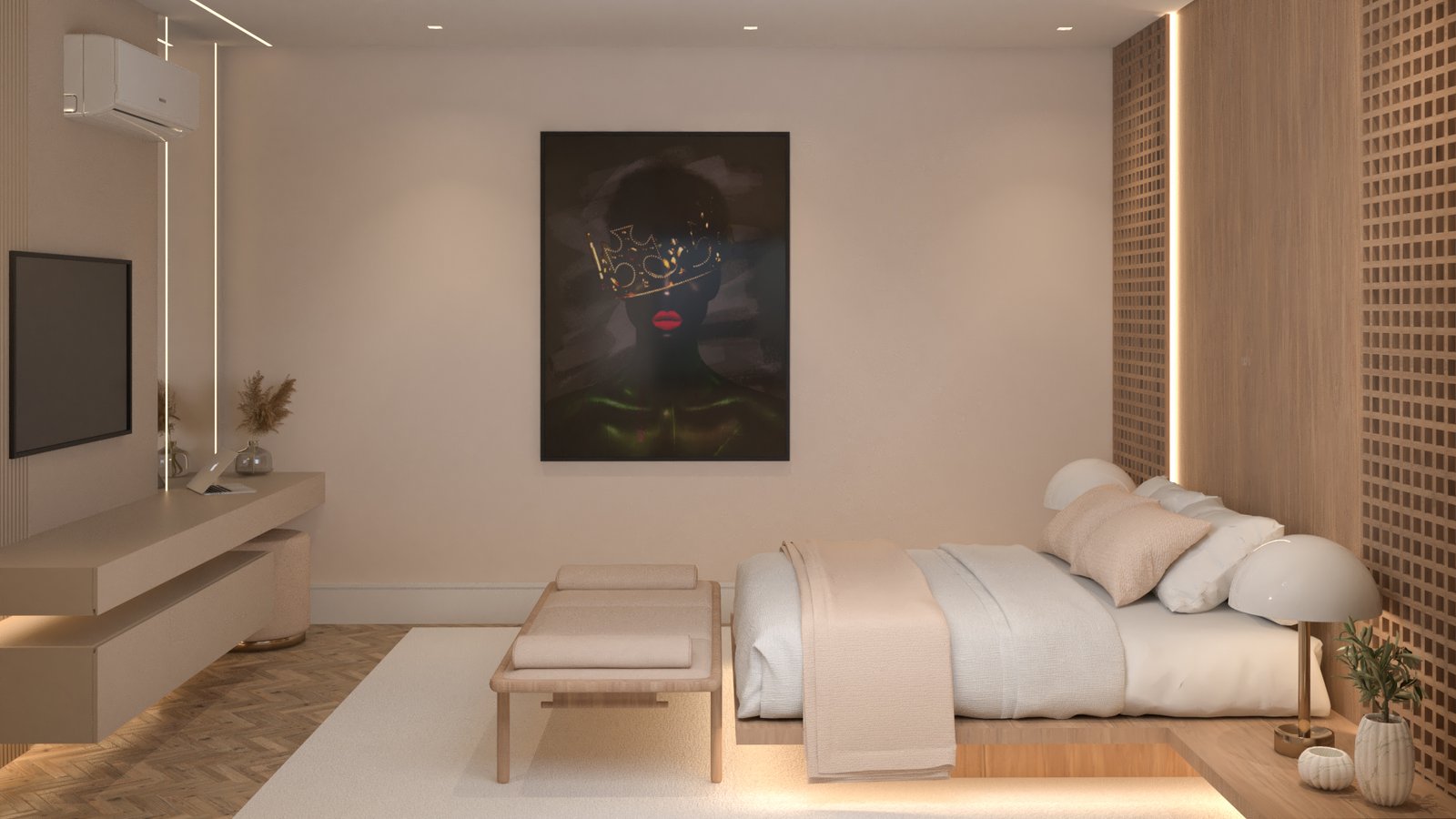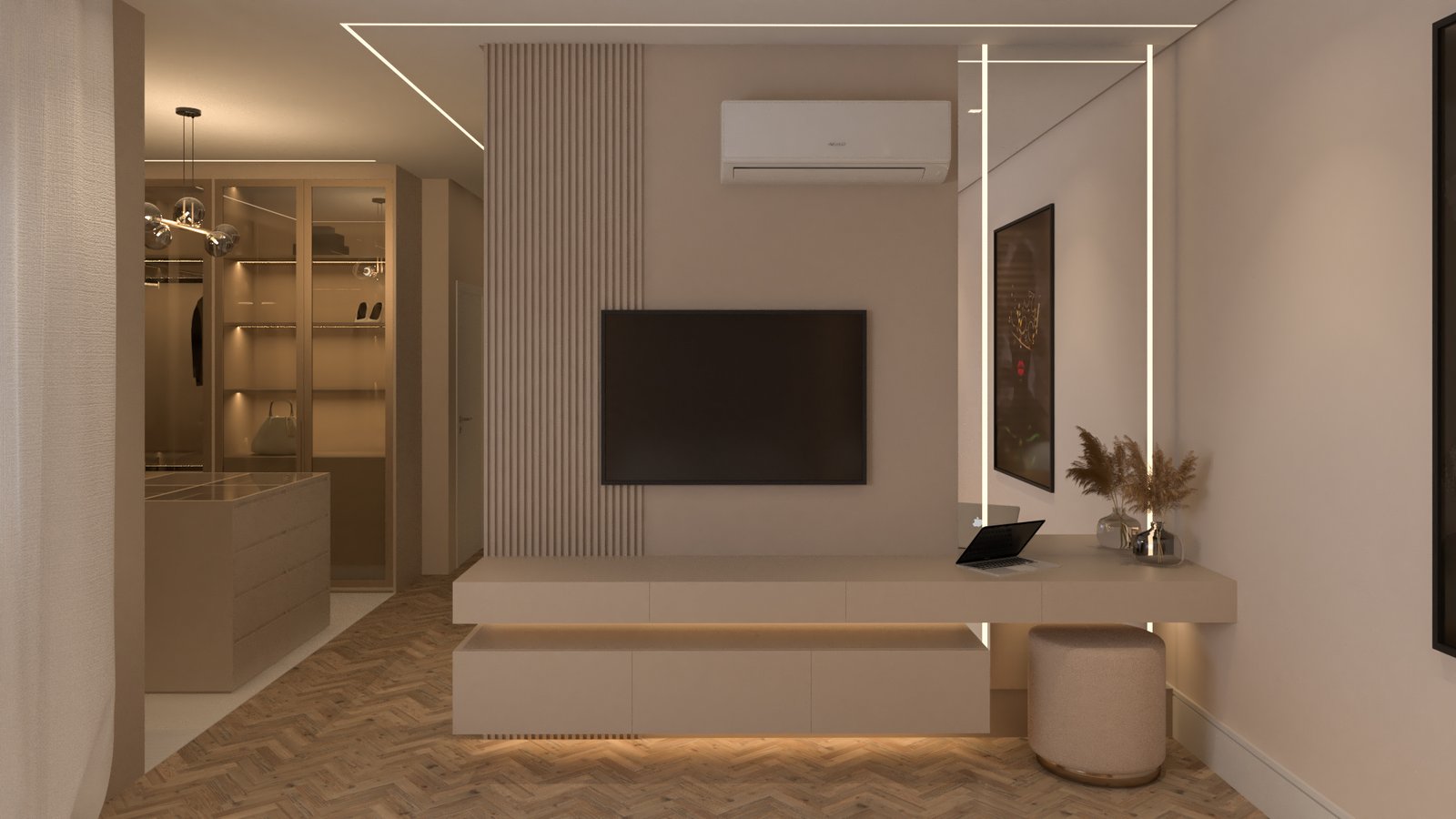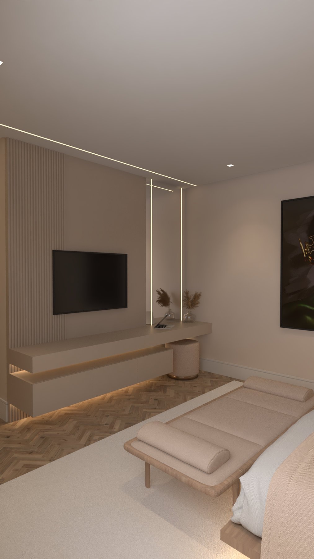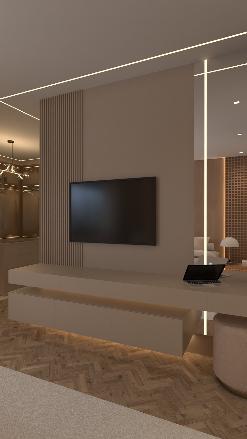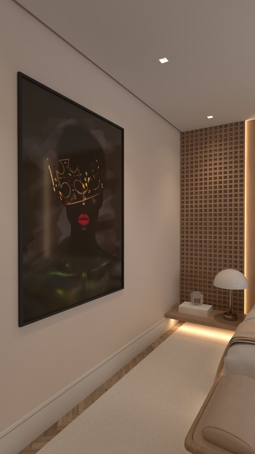 Recém-casados nos procuraram para transformar o living em um espaço acolhedor e integrado. Unimos estar, jantar e cozinha em uma planta fluida, com paleta e materiais contínuos que reforçam a harmonia e criam um ambiente contemporâneo e convidativo.